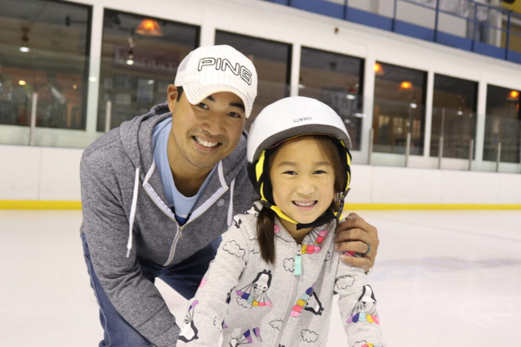Dad and 8 year old child at Stick & Puck practicing hockey together. Hockey is a lifetime sport for all to enjoy. Great for parents and kids.