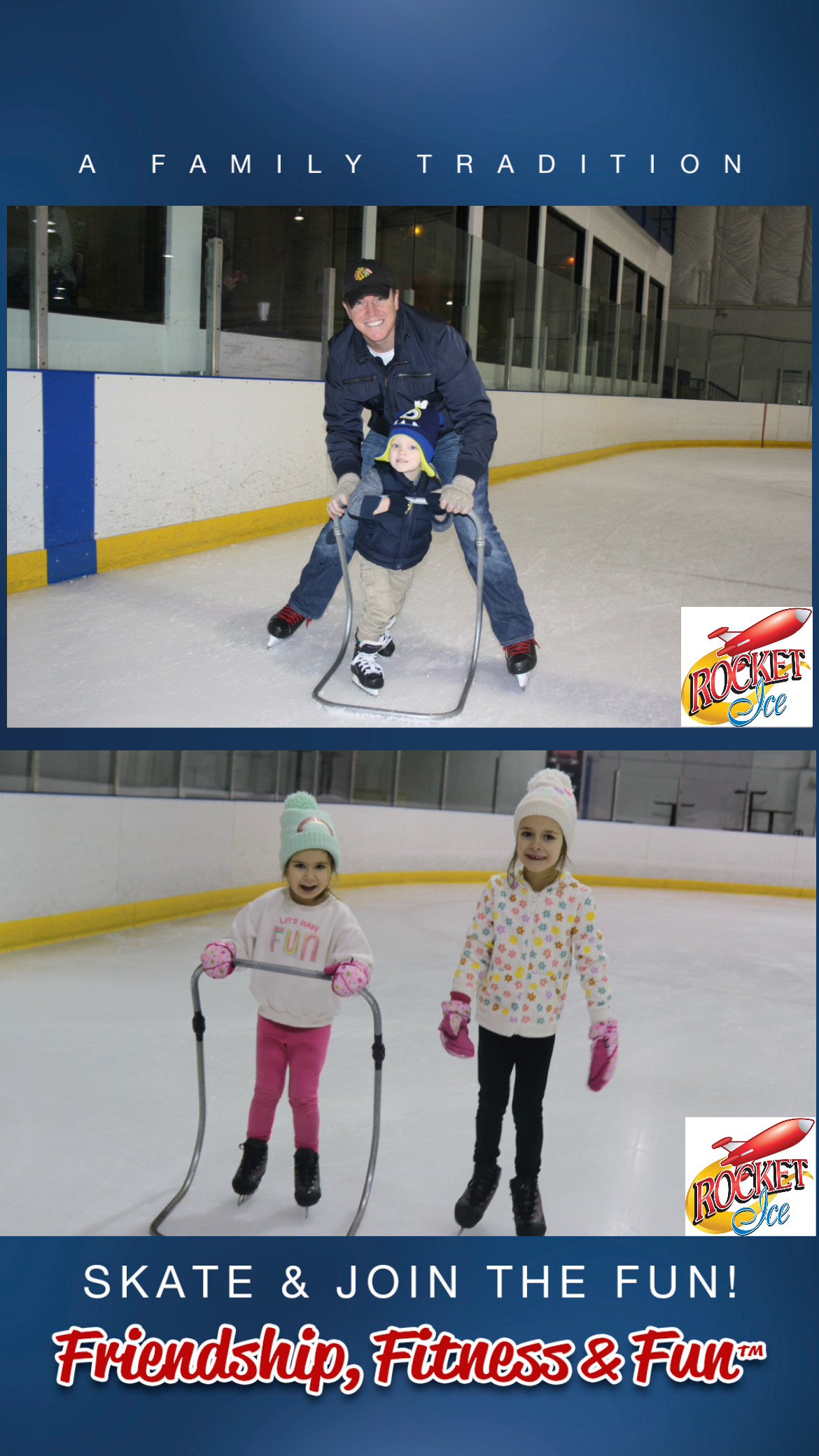 Public ice skating at Rocket Ice Skating Rink provides a great opportunity for the whole family to get out on the ice together. It is a fun setting for beginners to give skating a try in a relaxed environment. The music rocks and the mood is friendly, so come out and join the fun! See calendar below for dates and times. Purchase and reserve your spot online now!
